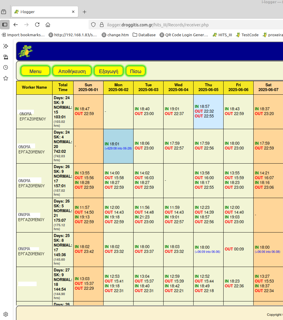 Η εφαρμογή i-logger υπολογίζει επίσης βάσει των αποθηκευμένων στο αρχείο του χρήστη εγγραφών , για κάθε εργαζόμενο μηνιαία ή περιοδικά , ημέρες και ώρες εργασίας.